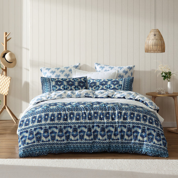 Logan and Mason Woolamai Blue Queen bed quilt cover set features a textured base that beautifully accentuates the mesmerizing watercolour tie-dye patterns intricately woven into the design. These tie-dye patterns, reminiscent of the ebb and flow of coastal waters, create a serene and calming visual experience. The cover is elegantly finished with a border print at the base, adding a touch of sophistication to the overall aesthetic. On the reverse side, a design in tonal blues and white perfectly mirrors the tie-dye aesthetics seen on the front.