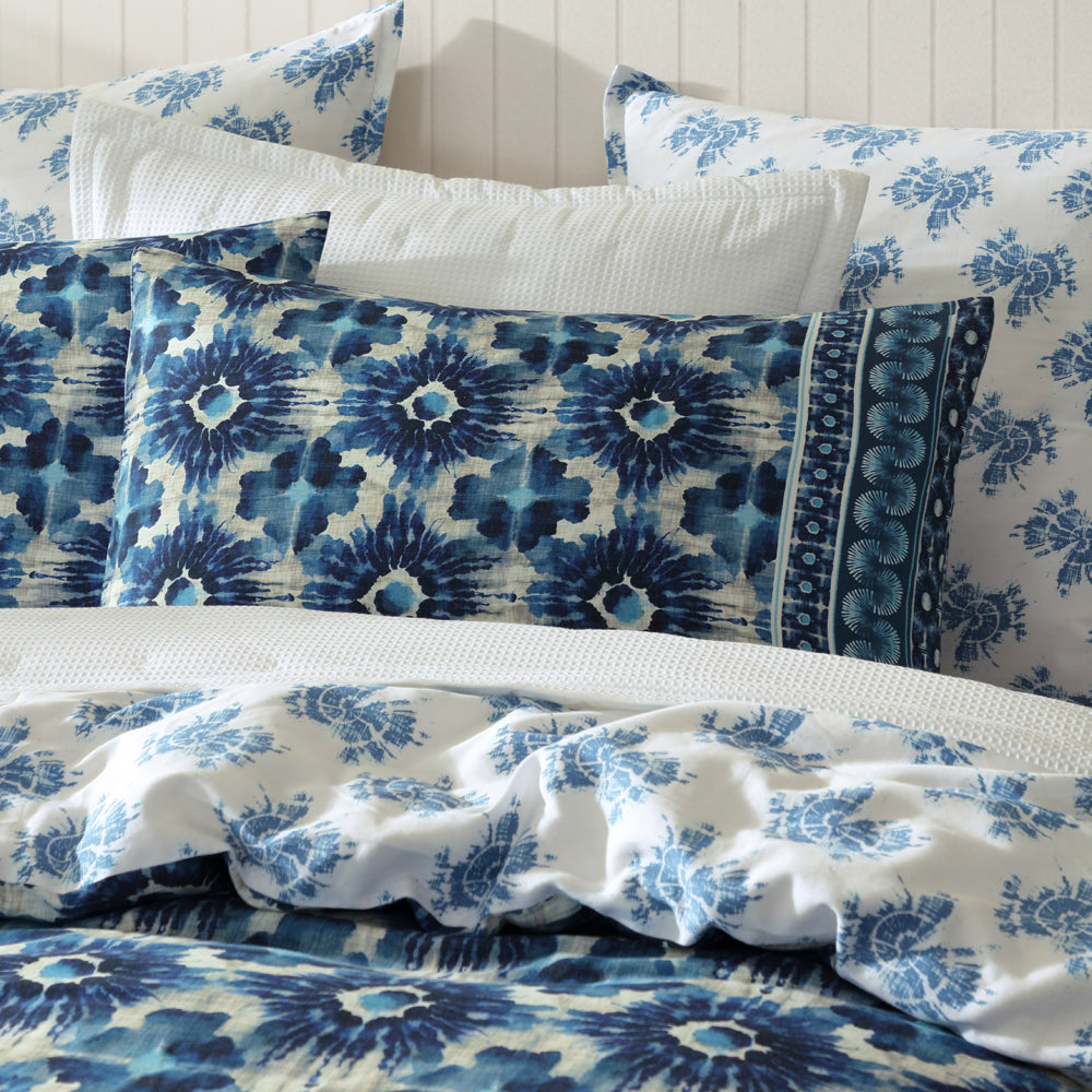 Logan and Mason Woolamai Blue Super King quilt cover set features a textured base that beautifully accentuates the mesmerizing watercolour tie-dye patterns intricately woven into the design. These tie-dye patterns, reminiscent of the ebb and flow of coastal waters, create a serene and calming visual experience. The cover is elegantly finished with a border print at the base, adding a touch of sophistication to the overall aesthetic. On the reverse side, a design in tonal blues and white perfectly mirrors the tie-dye aesthetics seen on the front.