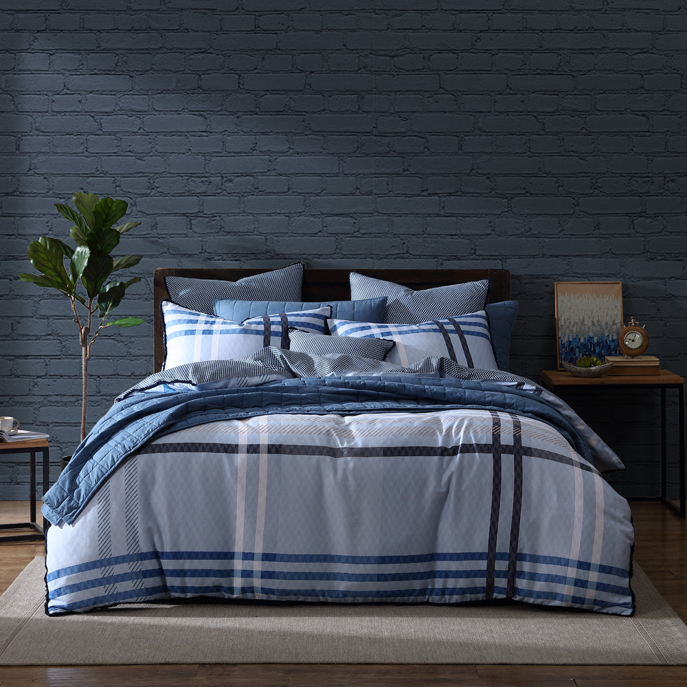 Logan and Mason Yarmouth Blue Double bed quilt cover set is a classic but modern approach to the traditional tartan pattern. It uses over scale and commercially loved colours, turning a traditional pattern into a design suitable for the Australian lifestyle. Yarmouth is simple but has fine details to create interest within the blocks of colour. Yarmouth has an urban mood with its unique fray edge trim and micro geo reverse in matching shades.