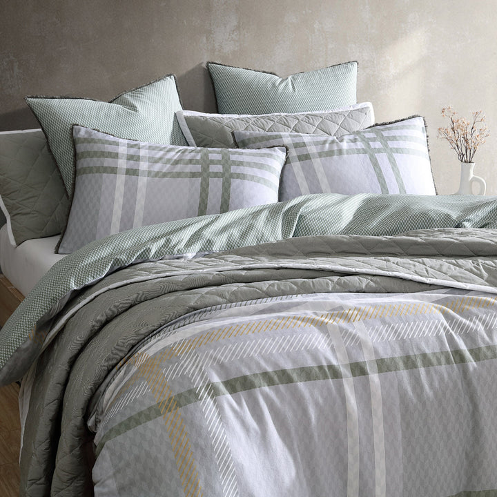 Logan and Mason Yarmouth Sage King bed quilt cover set is a classic but modern approach to the traditional tartan pattern. It uses over scale and commercially loved colours, turning a traditional pattern into a design suitable for the Australian lifestyle. Yarmouth is simple but has fine details to create interest within the blocks of colour. Yarmouth has an urban mood with its unique fray edge trim and micro geo reverse in matching shades.