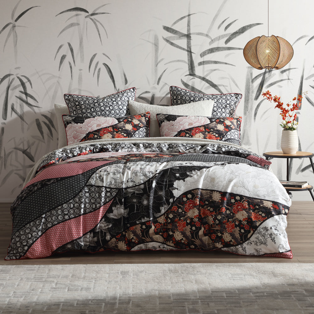 Logan and Mason Yume Red Super King quilt cover set showcases a visual display, featuring waves adorned with diverse Japanese prints presented in striking red, black, and white hues. These intricate prints embody the essence of Japanese artistry, evoking a sense of cultural depth and timeless allure. The design's incorporation of waves and traditional motifs creates a focal point that exudes both tranquillity and bold artistic expression. Complementing the front design, the reverse side features a sophisticated black and white spot print.