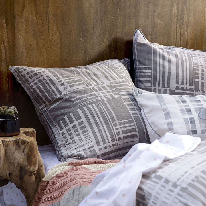 A fresh, modern take on classic tartan, the KAS Room Zaviour Double Bed Quilt Cover Set layers hand painted checks and intersecting bands of tonal greys and muted blush on textural slubbed cotton. Finished with piping for a tailored look, the reverse features a contrasting monotone spliced check.