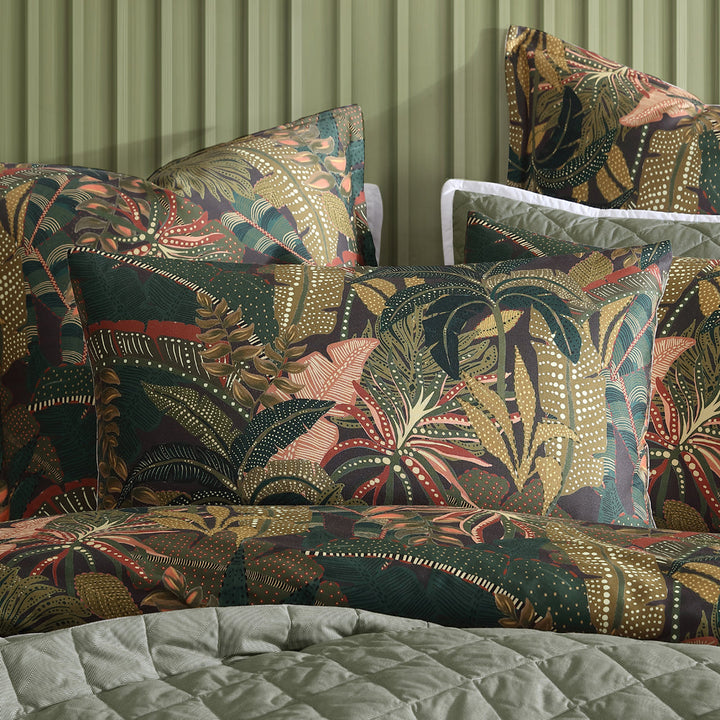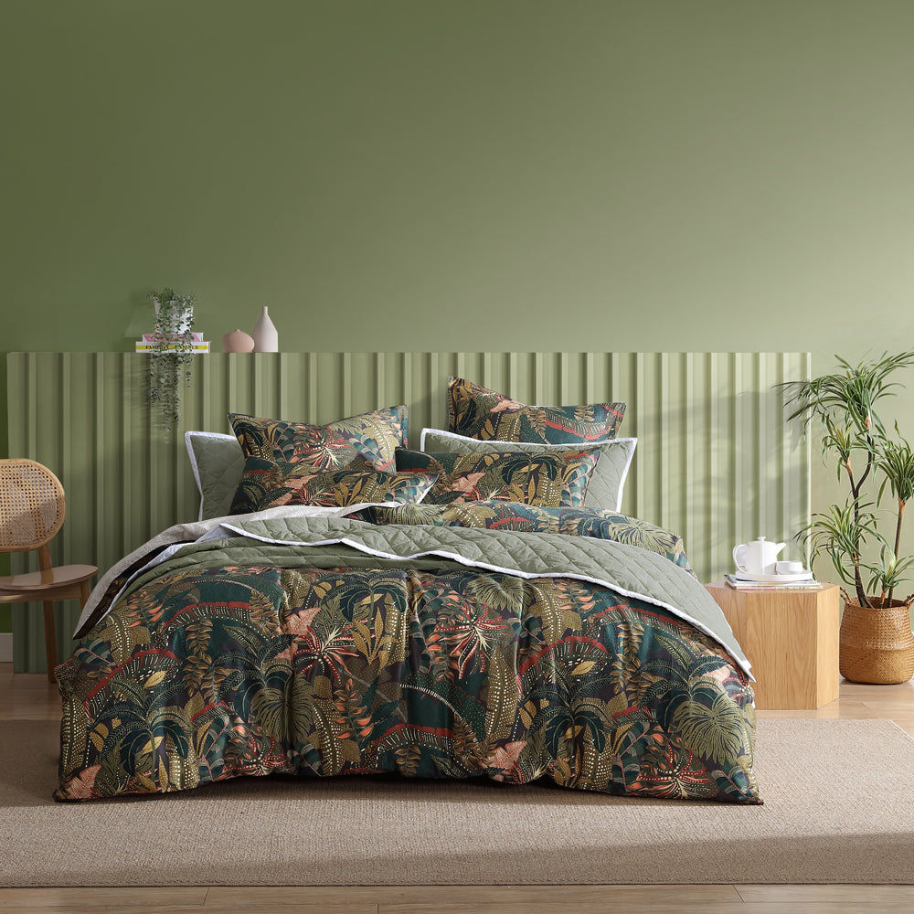 Logan and Mason Zawadi Green King bed quilt cover set reflects the everlasting tropical theme suited to the Australian style. Its dense foliage pops against the charcoal ground, and the naive art form with tribal elements create a modern whimsical feel. Zawadi has a reverse with a stylized leaf in a geometric pattern. The design is elevated by the bespoke tan/black gross-grain trim that frames the edges of the design.