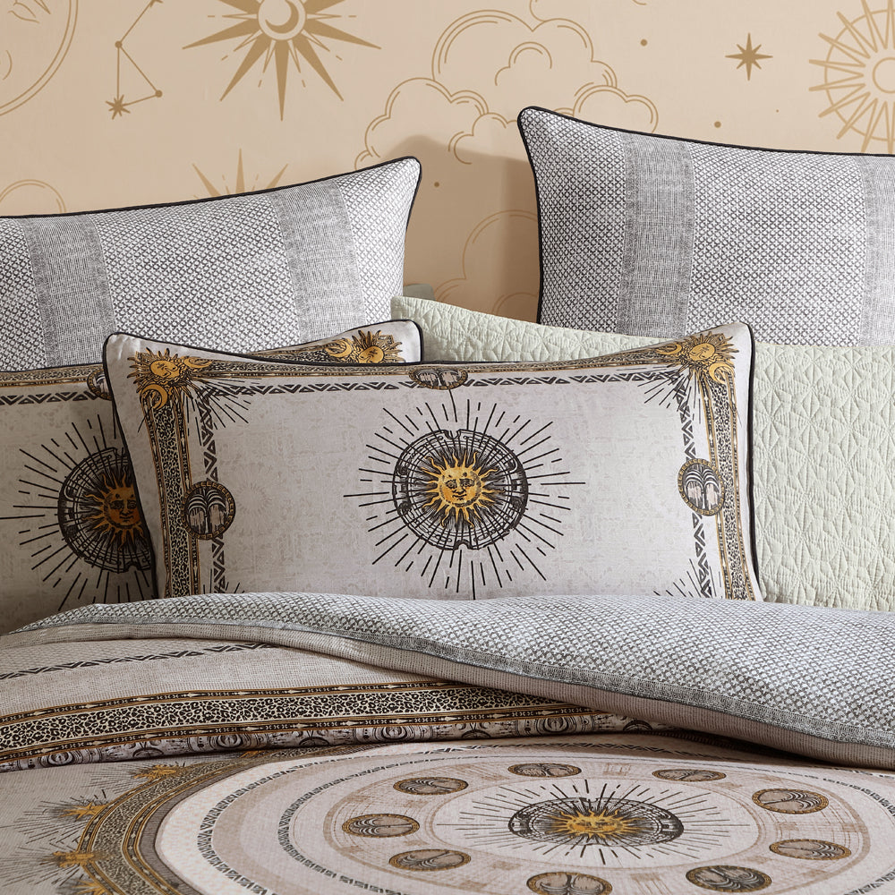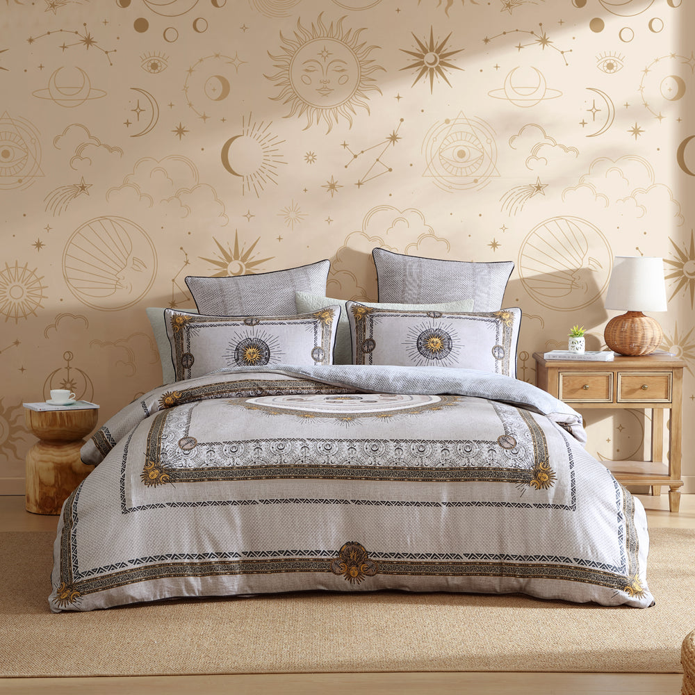 Embrace mystical boho charm with the Zepher Stone Super King Quilt Cover Set. A Greek Sun Medallion sits upon a stone mosaic pattern ground with pops of golden yellow and defined charcoal details. The borders incorporate a leopard-style pattern with tribal elements, while the reverse showcases a charcoal and white mosaic tile stripe and finished with charcoal piping.